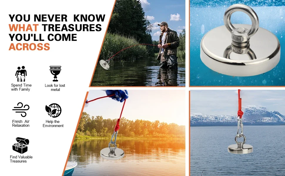 D16~D42mm Super Strong Neodymium Fishing Magnet N52 Heavy Duty Rare Earth Magnet with Countersunk Hole Eyebolt Salvage Magnetic